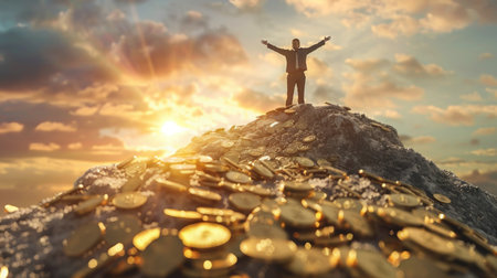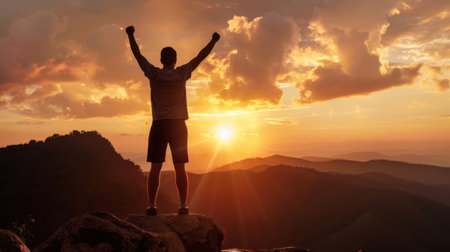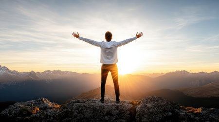 Triumphant man stands on mountain peak at sunrise, arms wide open, celebrating achievement, growth, and personal success.