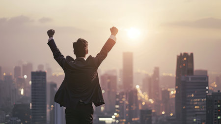 A man is standing on a rooftop in a city at sunset, holding a book. Concept of freedom and accomplishment, as the man is celebrating his success or achievement