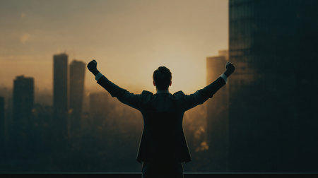 A person stands against a breathtaking sunset arms raised high in celebration expressing joy and accomplishment.