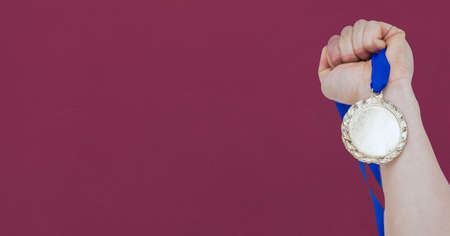 Win ,be a champion. Striving for achievements, concept, a female hand squeezes the winners gold medal, blue background