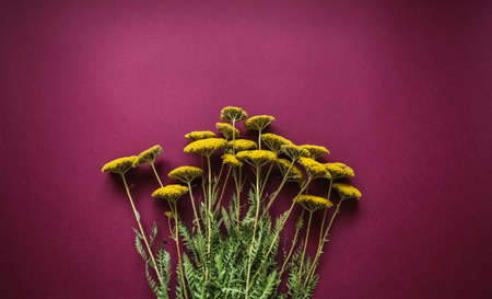 Achillea filipendulina - common names yarrow, fernleaf yarrow, milfoil, nosebleed - is an Asian species of flowering herbaceous perennial plants in the sunflower family, native to central and southwestern Asia. Top view, macro shot, close-up, yellow background