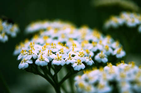 Medicinal plant yarrow, Achillea millefolium, white flowers close-up, selective focus.