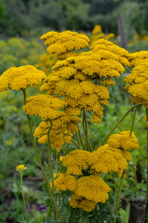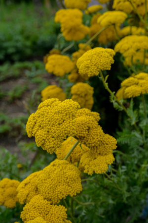 Yellow garden yarrow or Achillea plant flowering in a garden