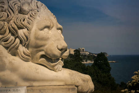 closeup head of old white marble lion sculpture in Vorontsov palace park in springtime against Black Sea in Crimea