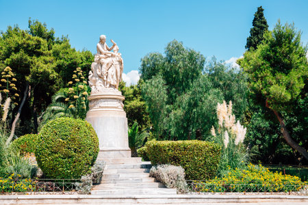 Athens, Greece - August 6, 2019: Statue of Lord Byron with green trees