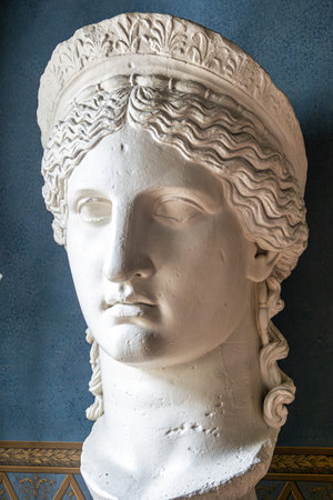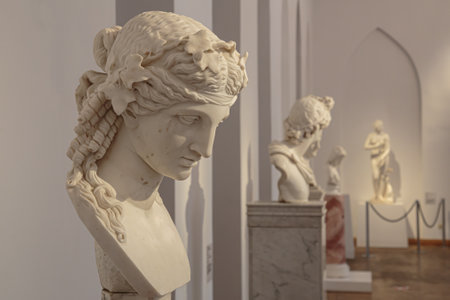 Moscow, Russia. September 29, 2020: Ancient statue heads. Plaster sculpture mans faces. Sculpture Collection, Hellenistic period, Moscow Caricino Museum