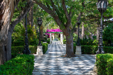 A landscape of the Alameda Apodaca park covered in greenery in Cadiz, Spai