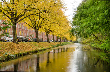 Rotterdam, The Netherlands, October 22, 2020: line of bright yellow linden trees in the grassy slope along Essenburgsingel canal in autumn