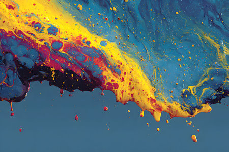 Vibrant and dynamic splashes of blue, yellow, and orange paint merge in an abstract flow against a contrasting background. this artistic composition highlights the fluidity and energy of liquid art. Generative AI