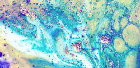Abstract paint background. Defocused teal color liquid fluid gradient flowing spreading covering chaotically glitter surface