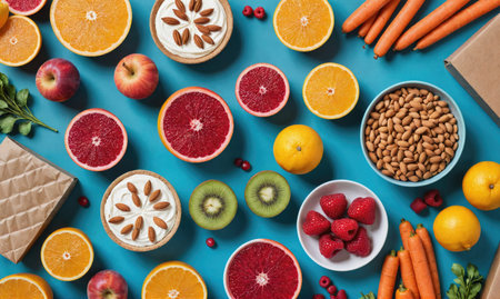 A diverse composition of nutritious food items elegantly presented in a balanced arrangement.