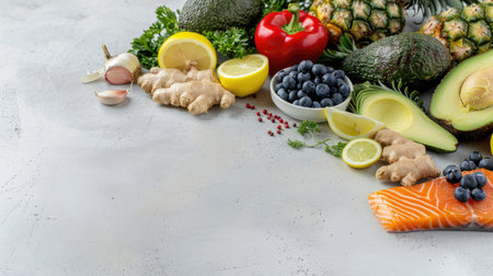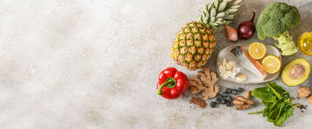 Vegetables, fish, fruits and spices for an anti-inflammatory and antioxidant diet, healthy food on light gray stone, panoramic format, copy space, top view from above