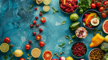 A flat lay of assorted colorful vegetables and fruits arranged creatively on a vibrant blue background.