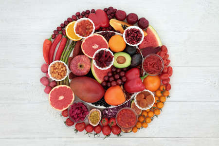 Immune boosting health food high in lycopene, anthocyanins, antioxidants, vitamins, minerals & dietary fibre. With fruit & vegetables in a circular design on a plate & loose on rustic wood background.