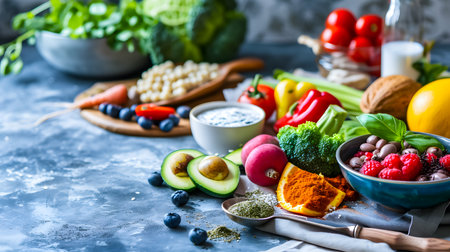 Fresh and vibrant ingredients arranged for a healthy meal preparation in a kitchen setting