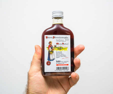 male hand holding bottle with Maria Treben plant balsam bitterer schwedentropfen