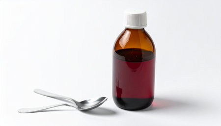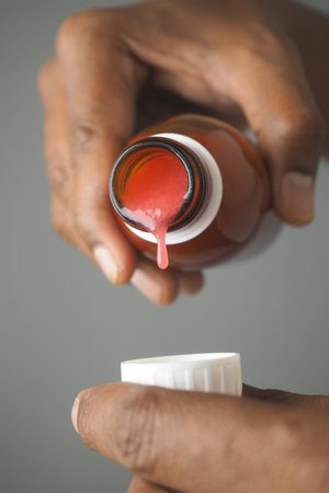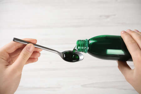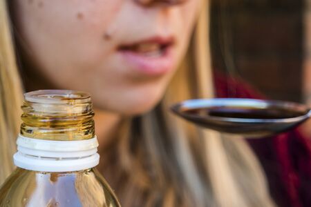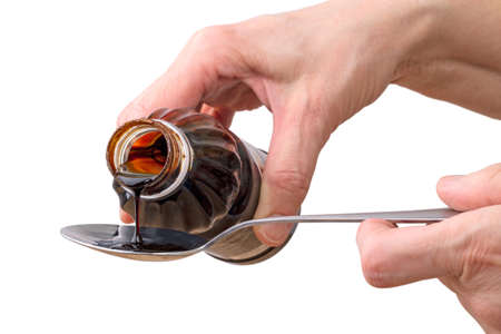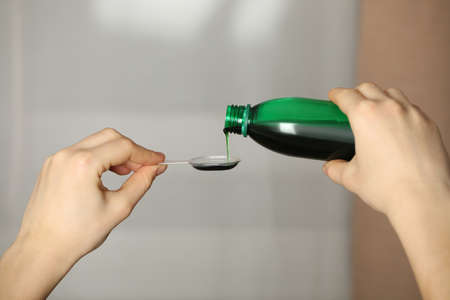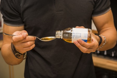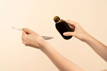 Image of hands with table spoon and bottle of medication. Pouring cough syrup or cold liquid medication into spoon. Bottle with no label.