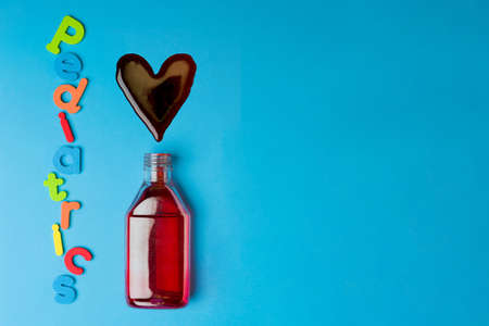 Pediatrics concept. Flat lay of a bottle of children's cough syrup with a heart next to copy space for text