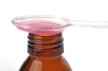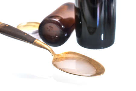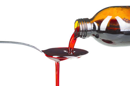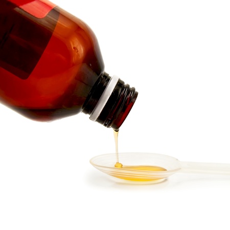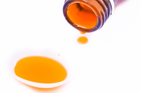 Yellow syrup poured from a brown bottle in a plastic spoon isolated on white background
