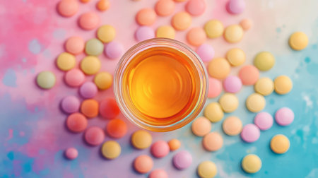A jar filled with honey sits atop a vibrant pastel background scattered with colorful candy discs.