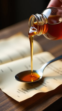 A vibrant close-up image showcasing red syrup pouring from a bottle into a spoon, ideal for themes related to food, medicine, or nutrition with a minimalist background.