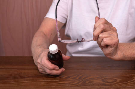 elderly woman holds a bottle of medicine, using glasses to read the instructions on the package before taking the medicine. The concept of the health of the elderly