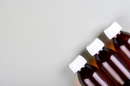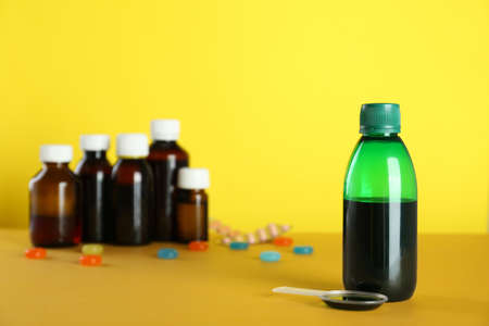 Cough syrup. Cold medicine. Pills and medicine on a yellow background. Pharmaceutical preparations for cough, flu, diseases. First aid kit. Syrup in a glass bottle.