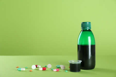 Bottle of cough syrup, measuring cup and pills on light green background. Space for text
