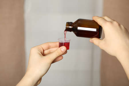 Woman pouring cough syrup into measuring cup on blurred background, closeup