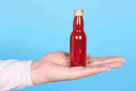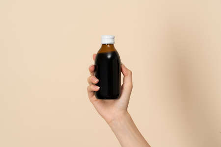 Image of hand holding a cold liquid medicine. Bottle without label for product placement. Everything on beige background