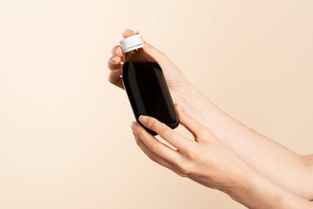 Image of hands holding a brown bottle of liquid cold medication. Bottle without label for product placement or product presentation. beige background.