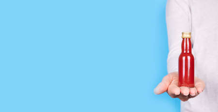 Close-up of red liquid drink in recycled glass bottle with diagonal shadow over celeste blue and white background. National Day concept. Copy space ready to add text.