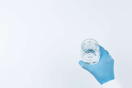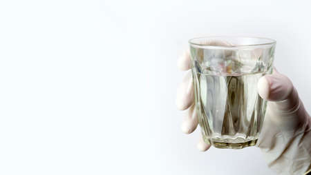 Gloved hands holding a glass of water
