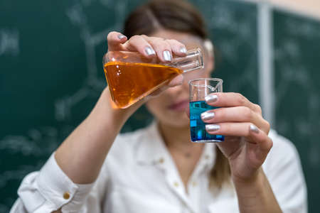 female teacher mixing multi colored chemical liquids together during a chemistry lesson. scientific