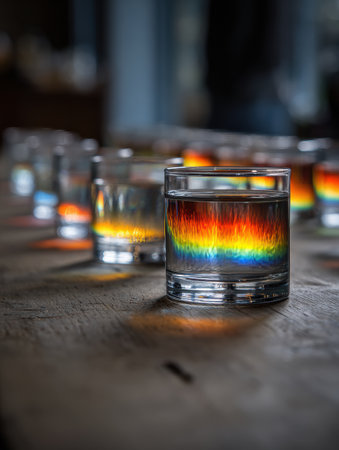Colorful refractions from glasses create a stunning rainbow effect on a rustic wooden table, enhancing the creative atmosphere of the room.