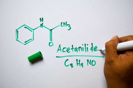 Acetanilide (C8,H9,NO) molecule written on the white board. Structural chemical formula. Education concept