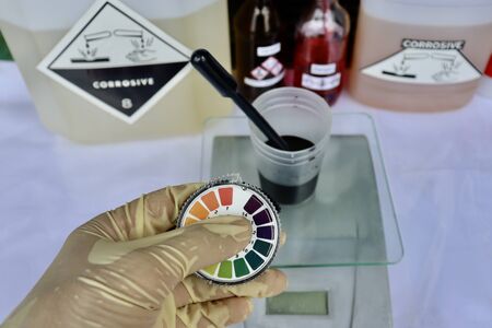 Cosmetics testing tools, pH test paper, rubber gloves, moisture meters, chemical solvents, etc. on the white background.