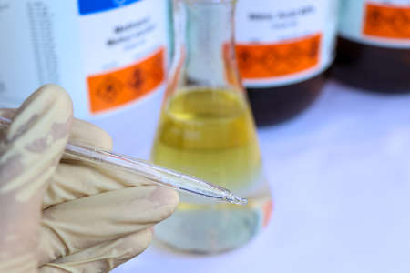 Hands of laboratory assistant in rubber gloves doing chemical analysis in the laboratory