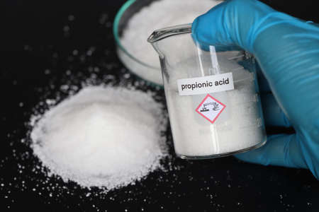 propionic acid in glass, chemical in the laboratory and industry