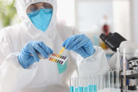 Close-up. Lab technicians hands in medical gloves, holding a litmus or reagent paper, conducting PH test, measuring the acidity or alkalinity of substances in a Petri dish in medical study laboratory