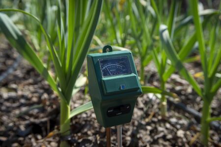 Agricultural meter to measure the moisture and pH content of the soil in a field with fresh green spring seedlings during crop cultivation