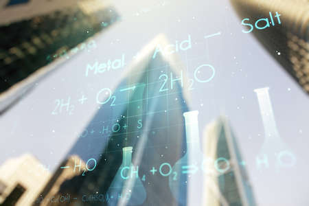 Creative chemistry hologram on blurry cityscape background, pharmaceutical research concept. Multiexposure