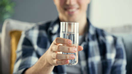 Young man drinks a glass of water