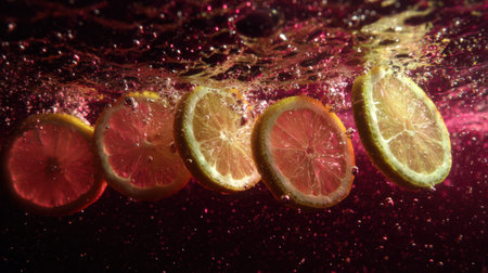 A sequence of lemon slices falling in time-lapse style into glowing water, color-rich berry punk tones, glassy water effects