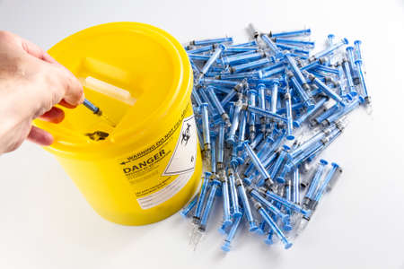Needles being put ito a sharps bin