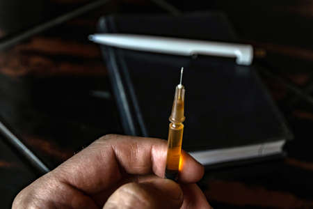 syringe in a person's hand, on a notepad background, short focus, toning