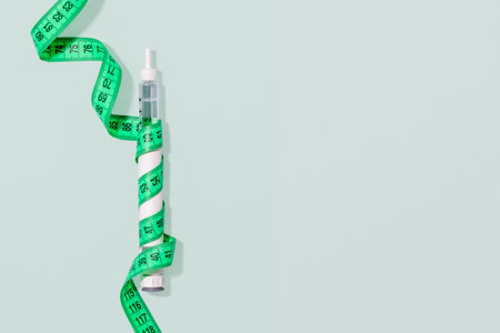 Slimming Injection Pen Wrapped With Measuring Tape On Pastel Background With Copy Space