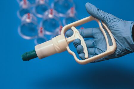 Jars for hijama. Vacuum pumps on a blue background
