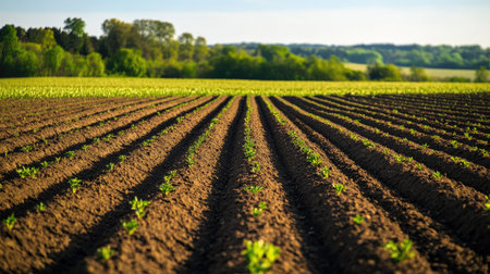 Farmland with neatly plowed rows stretching towards horizon, clear blue sky setting, highlighting vast expanse of agricultural potential, concept of farming, crop production, rural landscape.
