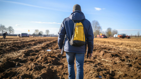 A man with a metal detector explores a barren field under a clear blue sky, representing exploration and adventure.